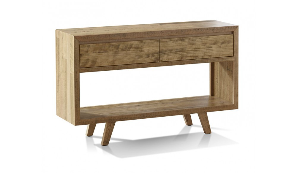 Embrace the beauty of timber with this light and stunning hall table. A light Tasmanian oak finish enhances the appearance of the contrasting grain to give characterful style. Concealed handles give a streamlined look and a combination of open shelves, drawers and cupboards provide plenty of storage flexibility. Angled timber legs add to the contemporary styling. Each hall table is one of a kind - featuring uniquely individual natural character with the distressed finish displaying the beauty of natural timber in its raw state. Give your living room a modern makeover with this timber beauty.