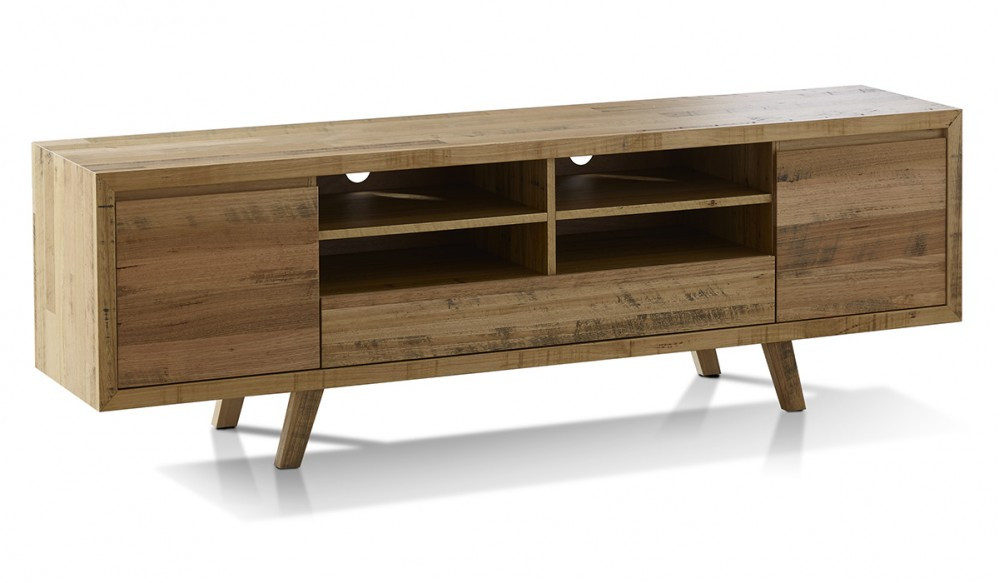 Embrace the beauty of timber with this light and stunning Lowline TV unit. A light Tasmanian oak finish enhances the appearance of the contrasting grain to give characterful style. Concealed handles give a streamlined look and a combination of open shelves, drawers and cupboards provide plenty of storage flexibility. Angled timber legs add to the contemporary styling. Each Entertainment unit is one of a kind - featuring uniquely individual natural character with the finish displaying the beauty of natural timber in its raw state, and also having a striking appeal ticking all the boxes for a modern makeover in your living room.