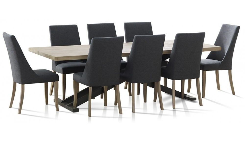 Relaxed coastal chic combines with a hint of industrial style with this contemporary 9 piece dining suite. Blonde Acacia timber has been highlighted with a whitewashed finish for a beach-side vibe. Cross bar metal legs add a modern industrial edge to this bold dining table which is complemented by eight stylish upholstered fabric dining chairs with matching blonde timber legs. If you’re looking to add that industrial vibe to your living room then the Bari dining suite might be just what you’re looking for.