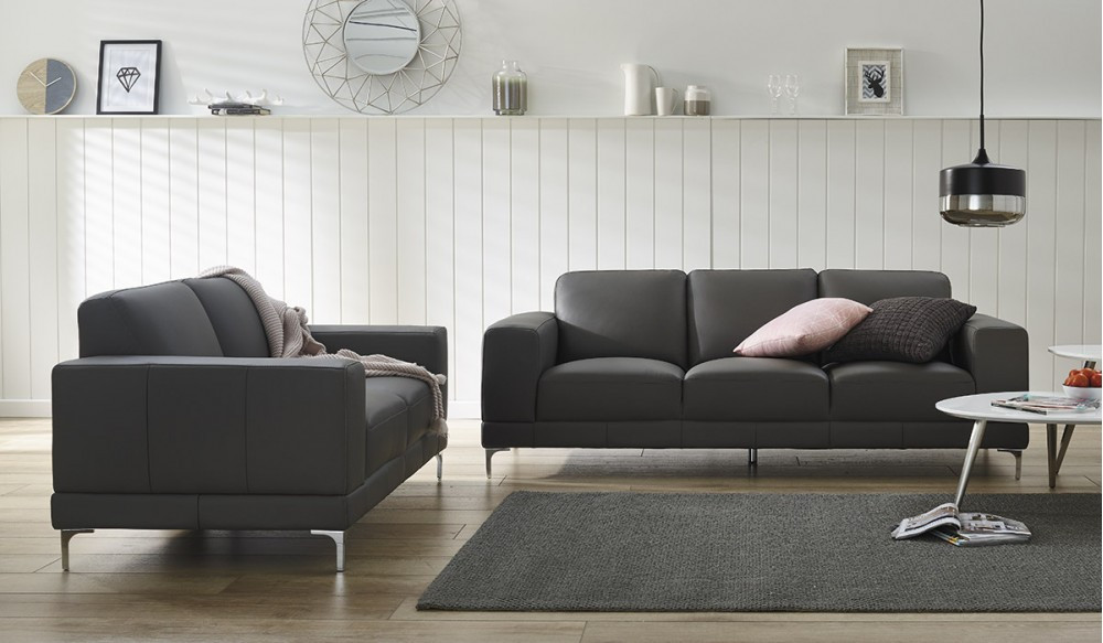 Elevate your lounge-room to new heights with this stylish contemporary 3 and 2 seater couch. Beautifully upholstered in 100% leather with sleek metal legs, the cosmopolitan design will add instant flair to any modern living room. Deep padded back cushions and seats give sumptuous comfort while wide arms provide plenty of room to rest your head, stretch your legs or perch a drink for luxurious lounging. Available in both a black and charcoal grey smooth and silky genuine 100% leather.