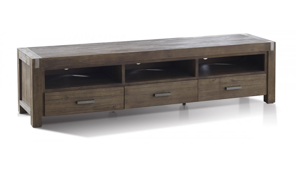Beauty abounds with this chic and stylish lowline TV unit. Crafted from hardwearing Acacia wood, the brushed finish emphasises the variations in the materials to add character and style. Brushed metal edges and door handles add an eye-catching design. Completing the look is the symmetrical layout of three drawers with three openings placed above providing ample storage solutions for your DVD library filled with music and movies to waste the night away. Creating an uplifting new look for your home has never been easier with this beautiful entertainment unit.