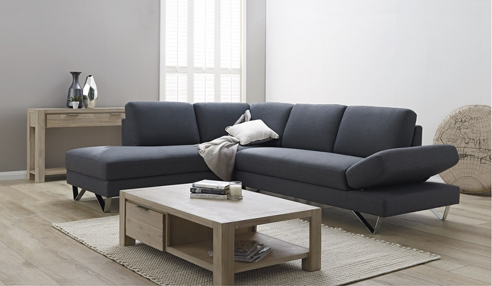 The smart design of this sleek corner chaise adds to its contemporary appeal. Featuring a moveable arm rest, you can adjust it to suit you while you sit, or use it to rest your head. Tilted back seats add to the comfort of this lovely lounge while the streamlined design gives great versatility to suit a variety of homes. Finished in a hardwearing fabric in on-trend grey for a smart look.