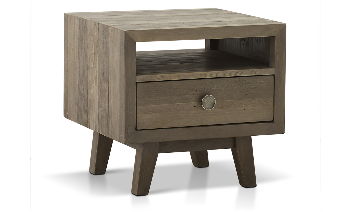 Give your living room a modern makeover with this stylish lamp table featured in a rich autumn brown. Contrasting timber panels featured in a brushed solid timber finish add character to create a warm and inviting home interior. This lamp table has one large drawer with a matching round metal handle and an open cavity above for ample storage to hide away all those magazines and books.