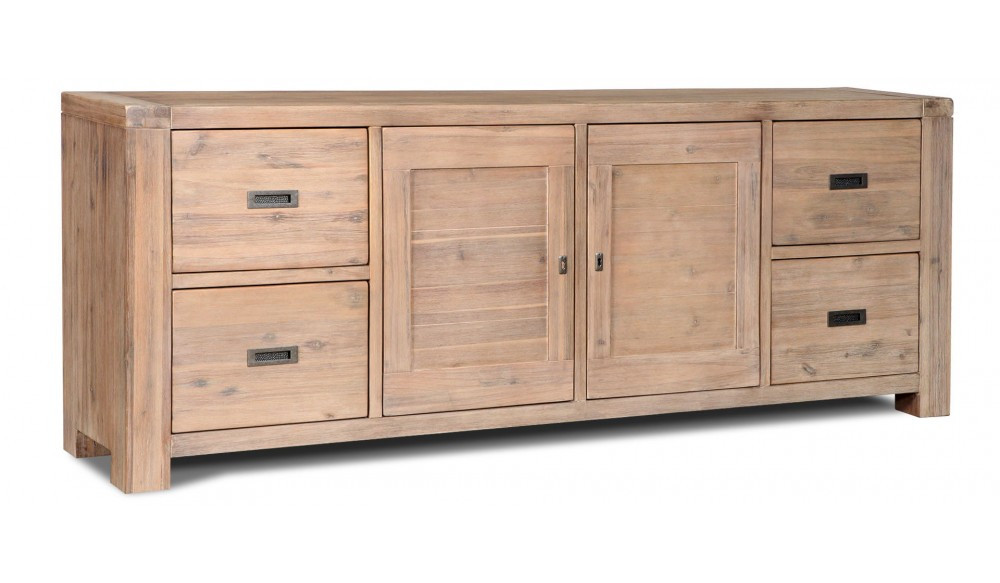 Hardwearing Acacia timber has been given an earthy natural look with a weathered finish to this large feature buffet. Chunky timber legs form a frame around 2 sets of drawers either side with recessed metal handles and two good sized cupboards in the middle creating ample room for all your crockery. The light timber tones give a fresh modern style to suit a variety of interiors. Mix and match across this range for a complete co-ordinated styling solution for your home.