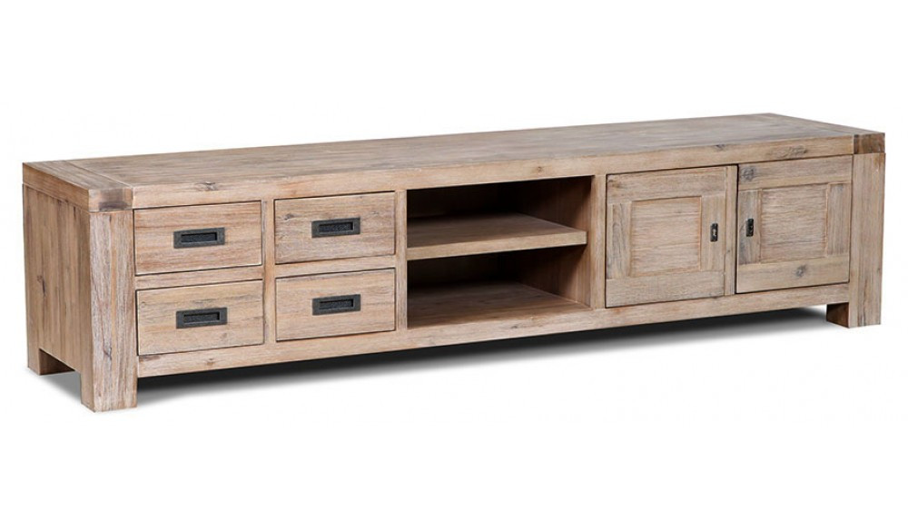 Hardwearing Acacia timber has been given an earthy natural look with a weathered finish to this solid looking lowline TV unit. On the left hand side it has four DVD/video drawers with recessed metal handles and on the right is 2 matching cupboards with ample storage space. In the centre is a generous cavity space with a shelf for the entertainment system to enjoy the night away. The light timber tones give a fresh modern style to suit a variety of interiors. Mix and match across this range for a complete co-ordinated styling solution for your home.