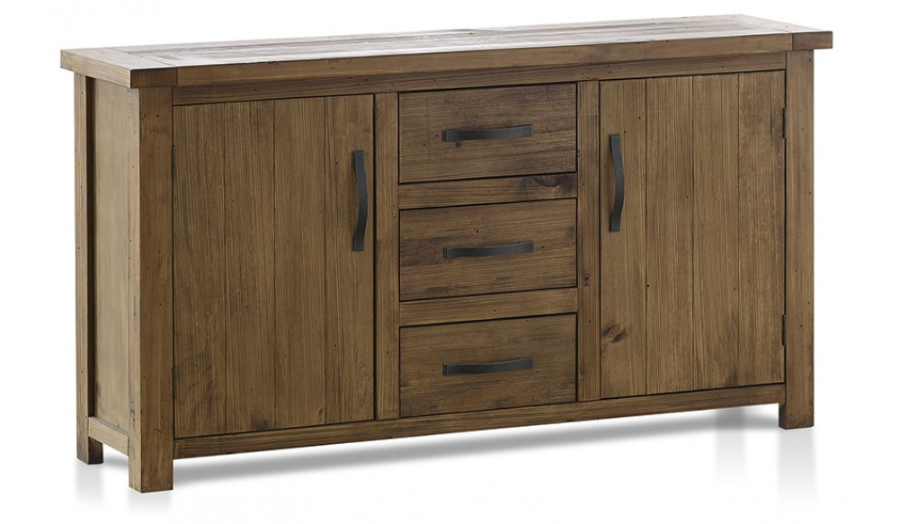 Get down to earth with this rustic looking buffet. Contrasting timber panels with a brushed finish emphasise the look and feel of an authentic timber grain. The solid design style adds to the durability of this contemporary suite. Three central drawers flanked by two cupboards with dark metal handles provide ample storage space for all your crockery.