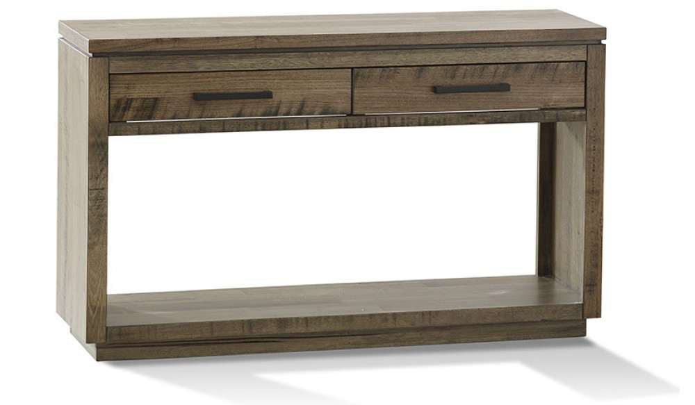 Embrace Tasmanian Oak with this contemporary hall table. A complete furniture solution, you can enjoy a modern makeover for your living room in an instant with this stylish range. The finish is made up of random timber panelling with a reclaimed feel. Tiny nail holes are exposed to accentuate the modern reclaimed look. This hall table features two sleek drawers with dark metal handles and an open space below where you can display your accessories. With this stylish range, get set to raise your living room to a whole new level.