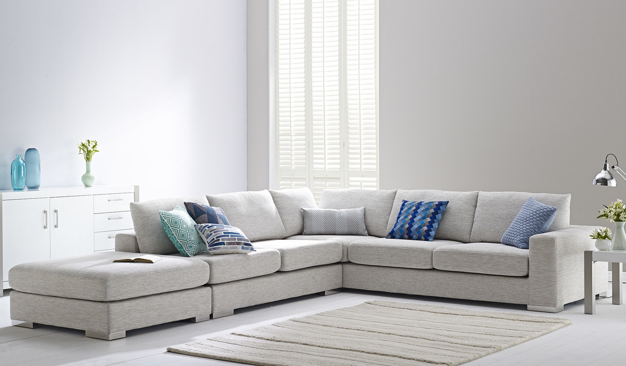 This contemporary 6-seater corner modular sofa with ottoman has up to 4 different configurations to choose from to provide plenty of styling flexibility to suit every home. Opt for a left or right hand arm or swap the 2 seater and 3 seater position to suit your room shape and size. Use the ottoman as a chaise for stretching out, a handy table to place your remotes and reading material, or place along the open end of the sofa to extend your lounging options. Lovely loose back cushions provide plenty of snuggle up comfort. Fully upholstered in a choice of Steel or Ice fabric to give a fresh modern look to your living room.